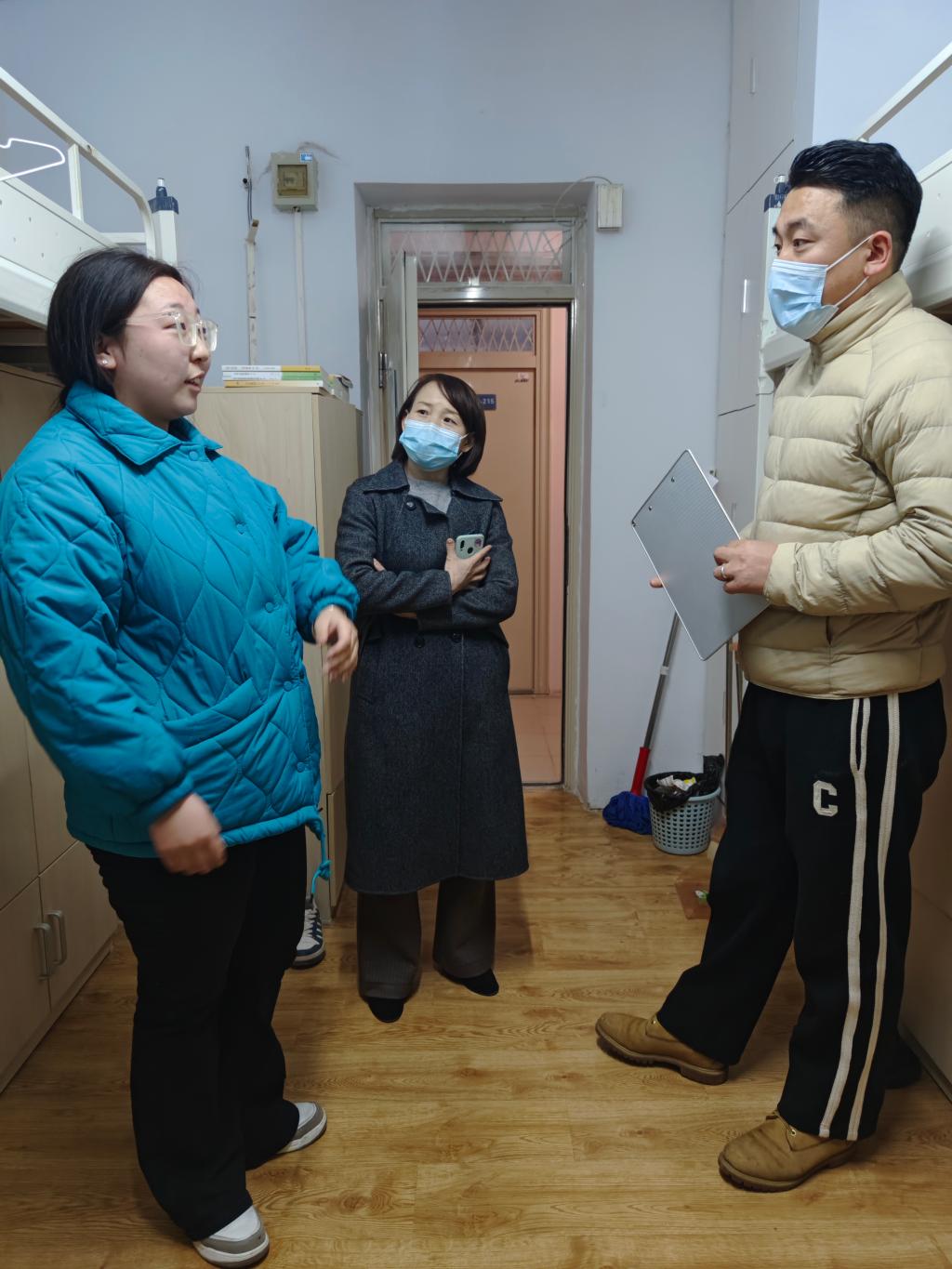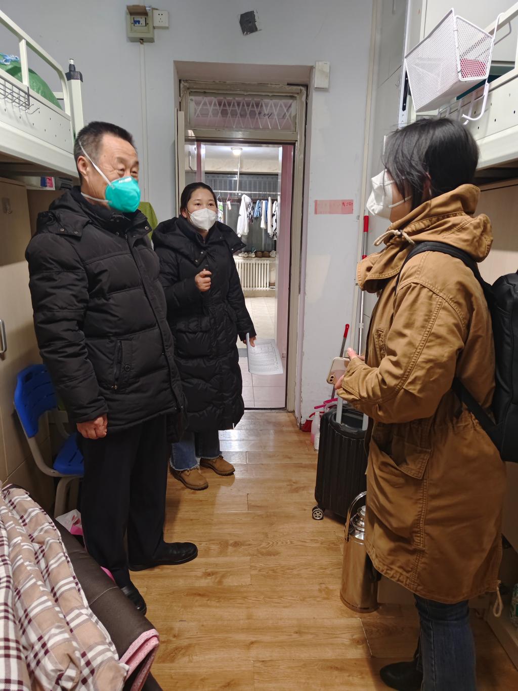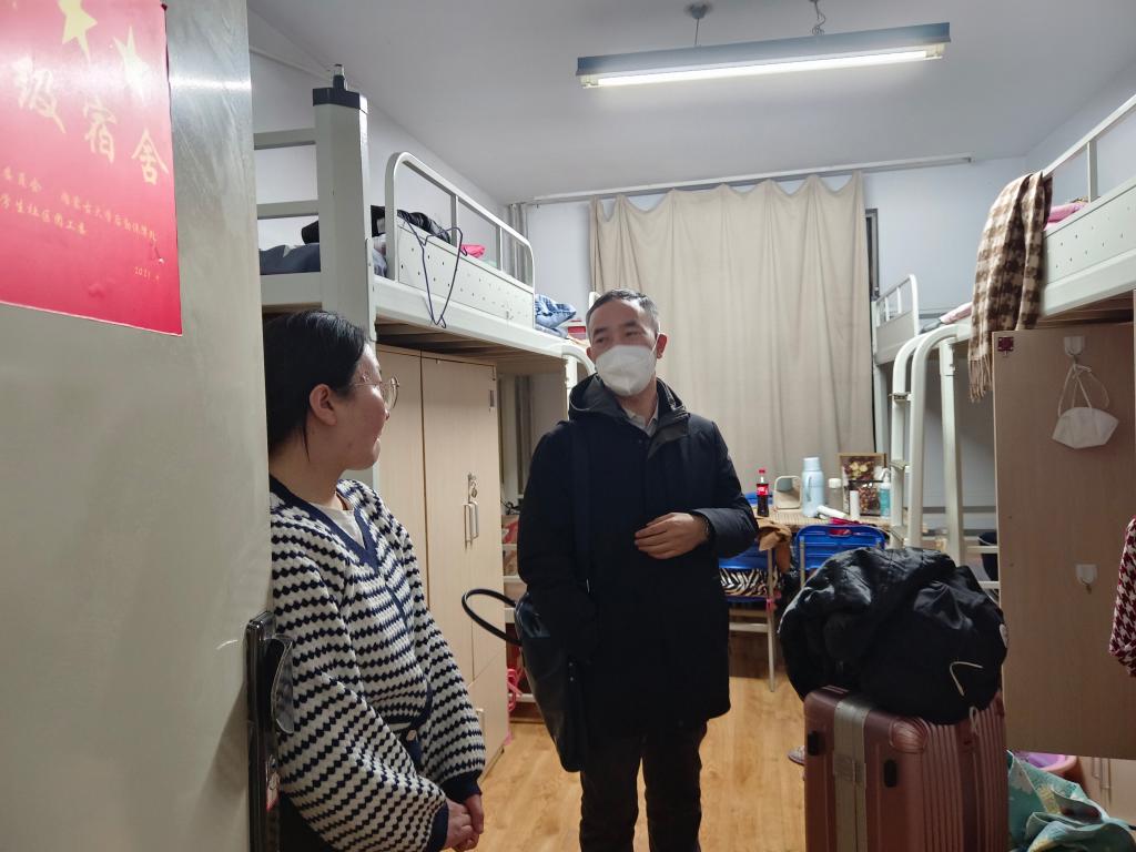 走访过程中,学院领导和老师看望返校的学生,并与学生亲切交谈。“经过寒假,重返校园是否适应”“授课方式转换,是否做好学习准备”“作为毕业年级的同学,论文写作和就业是否顺利”“家庭经济情况如何,是否需要帮助”……这些问题都是学院对学生们关心关爱和访谈交流的热点。同时,还不忘提醒学生遵守学校学生管理和宿舍管理的相关规定,抓好宿舍卫生,关注身体健康,提高安全防范意识。