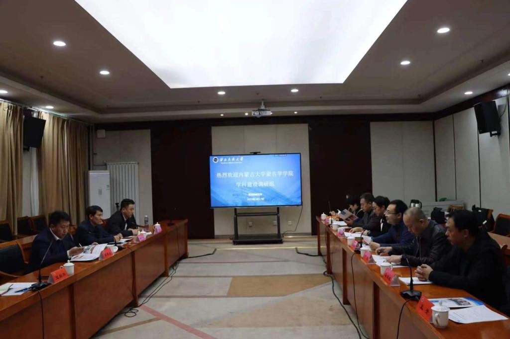为推进中国语言文学 “一流”学科建设和中国少数民族语言文学“一流”专业建设,太阳集团tyc151cc院长吴英喆、党委副书记孟海光、教务办主任宝勒尔、行政办主任包木仁于2023年3月17日至19日赴西北民族大学调研交流学科建设、人才引进、学生就业工作。