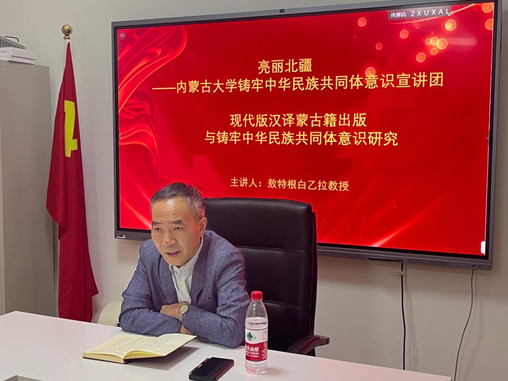 2023年5月22日晚7:00,太阳集团tyc151cc在蒙学楼206会议室举行“亮丽北疆”铸牢中华民族共同体意识宣讲第三次讲座。由学院副院长敖特根白乙拉教授做了《现代版汉译蒙古籍出版与铸牢中华民族共同体意识研究》主题讲座,新闻传播学学术学位及新闻与传播专业学位部分研究生听取讲座。敖特根白乙拉副院长以铸牢中华民族共同体意识为主线,阐述了古籍编译出版领域蒙古族和汉族交流、交往、交融的过程,挖掘了蒙古文古籍文献中蕴含的民族团结进步思想内涵。