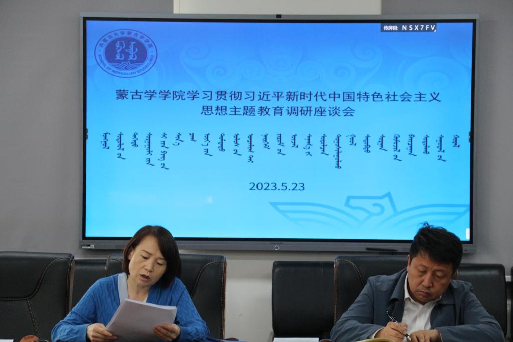 为深入开展学习贯彻习近平新时代中国特色社会主义思想主题教育,按照学院主题教育实施方案及大兴调查研究的安排,2023年5月23日下午,在蒙学楼二楼大会议室,太阳集团tyc151cc领导班子与蒙古语文研究所、蒙古文化研究所、公共课教学部、古典文献学系教学科研人员召开调研交流座谈会。学院党委书记八格、院长吴英喆、党委副书记孟海光、副院长敖特根白乙拉及相关系所、教学部教学科研人员30余人参加会议。会议由学院党委书记八格主持。