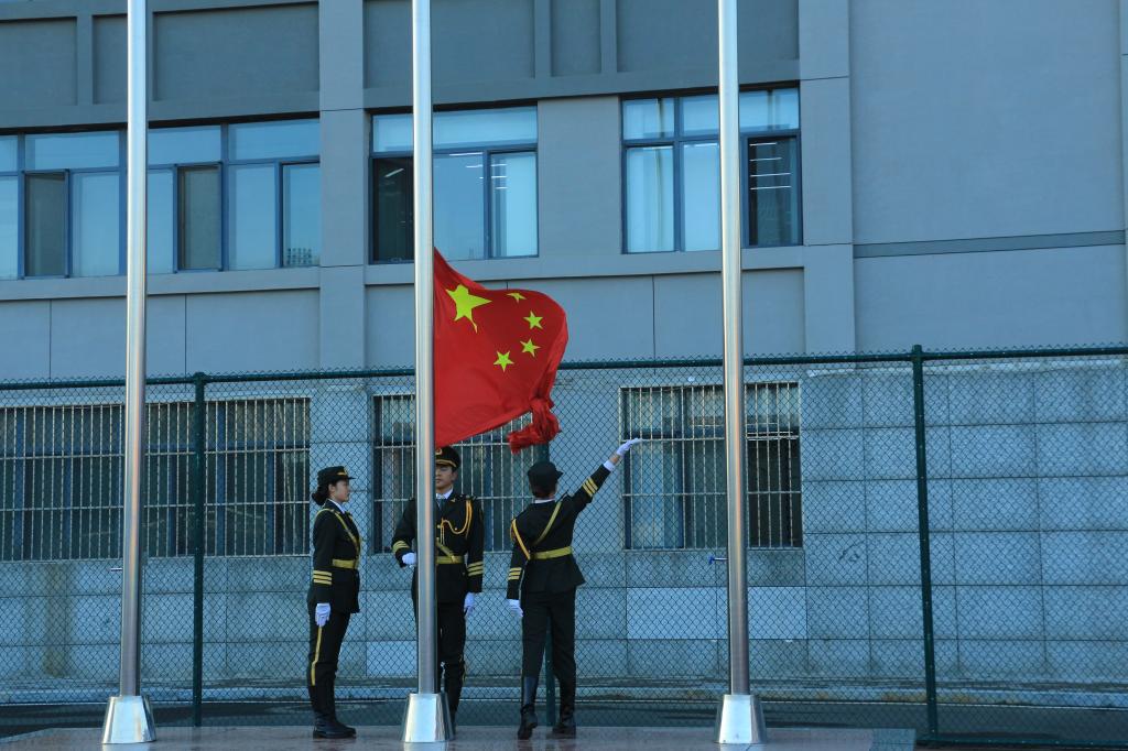 7点整,在雄壮的国歌声中,鲜艳的五星红旗徐徐升起,全体师生庄严肃穆,向国旗行注目礼。