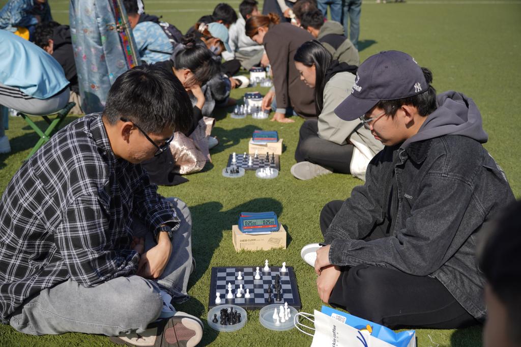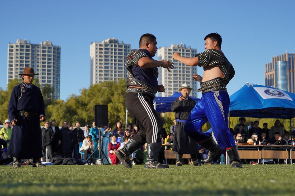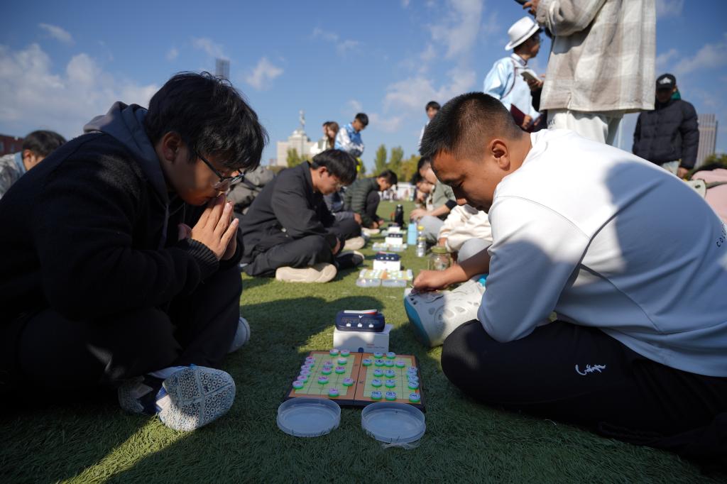 传统游戏比赛包括象棋比赛和沙嘎比赛。128名象棋选手围着象棋、蒙古象棋等各类棋盘摆好阵,在激烈的角逐中斗志斗勇。103名沙嘎选手在草坪上席地而坐,在技术的较量中尽显手法技巧。