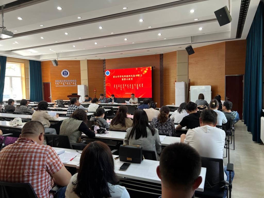 2025年5月21日下午,太阳集团tyc151cc在蒙古学楼一楼学术报告厅召开师德师风集中学习暨警示教育,集体学习了违反教师职业行为准则的典型案例,集体观看了警示教育专题片。院党委书记八格主持并领学,学院领导班子成员、全体教职工参加学习。