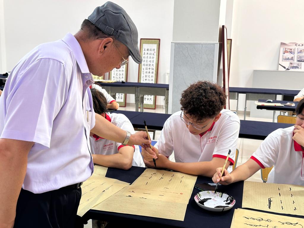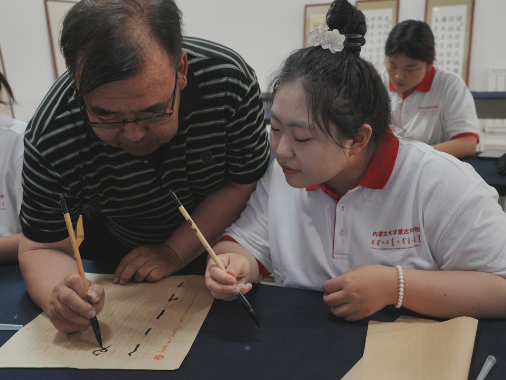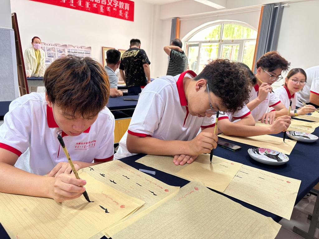 7月8日上午,实践团到包金山书法培训基地,在国家级非物质文化遗产传承人包金山老师的讲解下,了解到蒙古文书法在中华民族艺术交融中的特有精神气质、文化品格、学术价值和审美价值。在包金山老师指导下,实践团成员进行了现场书法学习,一笔一划临摹书写出一件件书法作品。