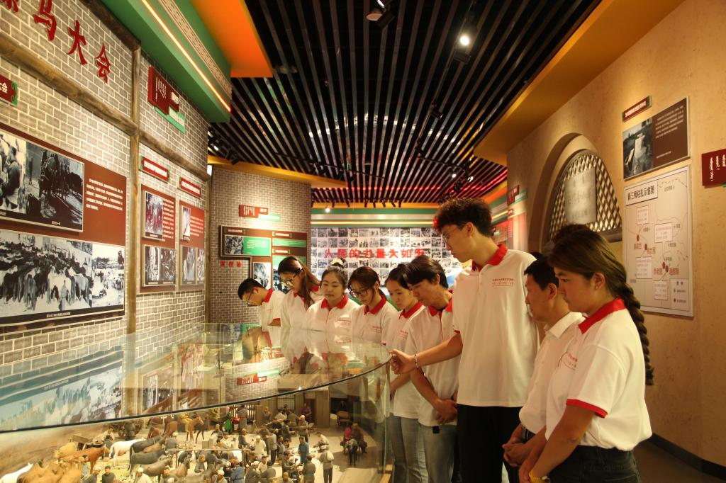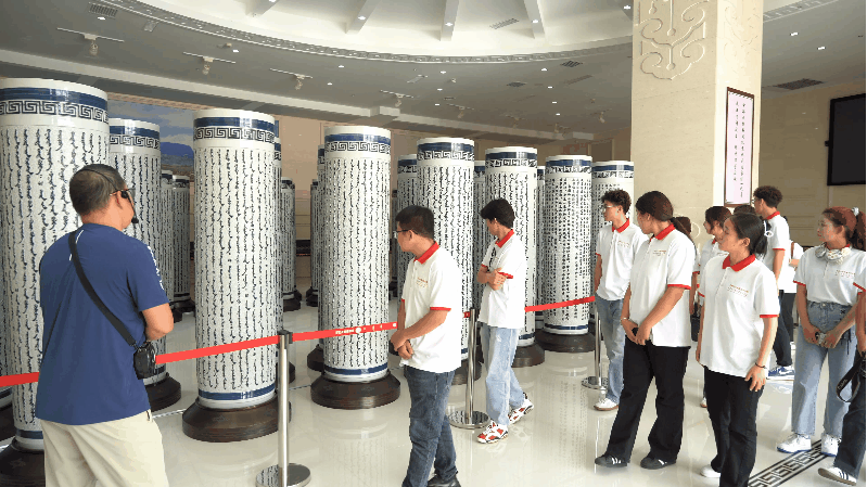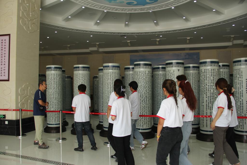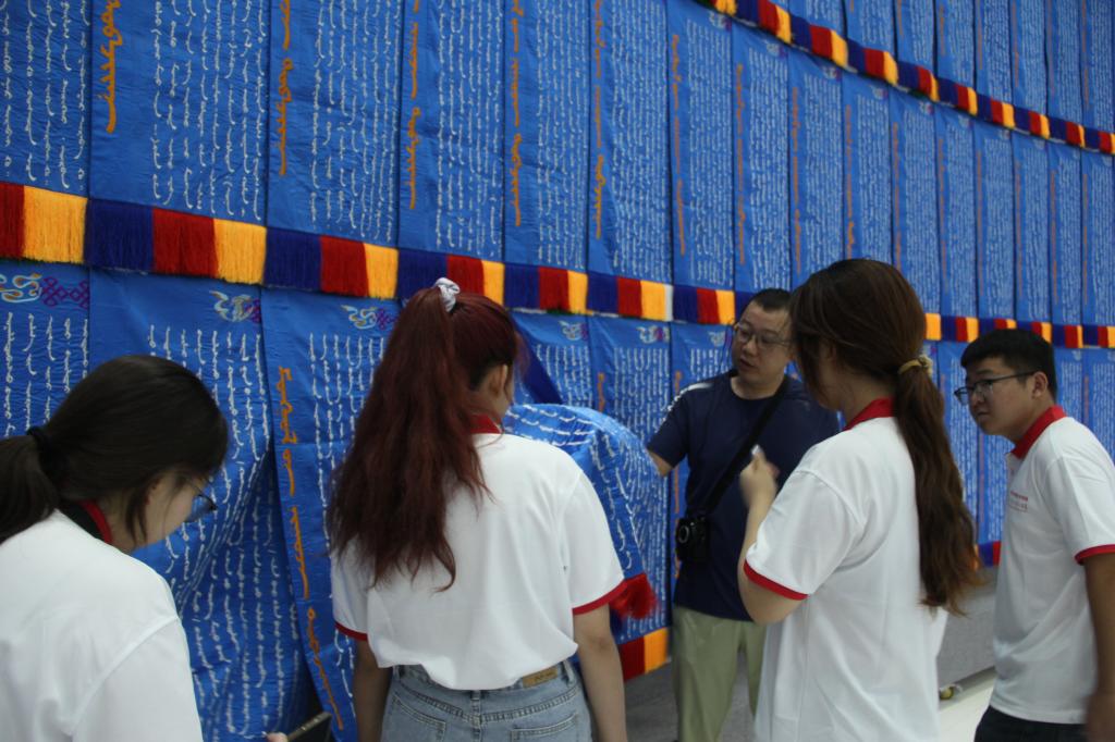 习近平总书记2019年7月16日考察tyc151cc太阳时做出“加强对蒙古文古籍的搜集、整理、保护,挖掘弘扬蕴含其中的民族团结进步思想内涵,激励各族人民共同团结奋斗、共同繁荣发展”的重要指示。7月8日上午,实践团前往鄂托克旗博物馆参观《蒙古秘史》展厅、古籍文献展厅、文物展厅和书法艺术展厅,认真观赏以《蒙古秘史》书法长卷(内蒙古自治区在2010年献给上海世博会的珍贵礼品)为基础创作的景德镇瓷柱、单面皮雕金箔涂饰、丝绸绣、红木雕刻书型、手工银板等及《格萨尔》《江格尔》《红楼梦》等古籍文献,了解到古籍文献中所记载的各民族交流交往交融的历史,感悟到中华民族共有精神家园建设的文化内涵。