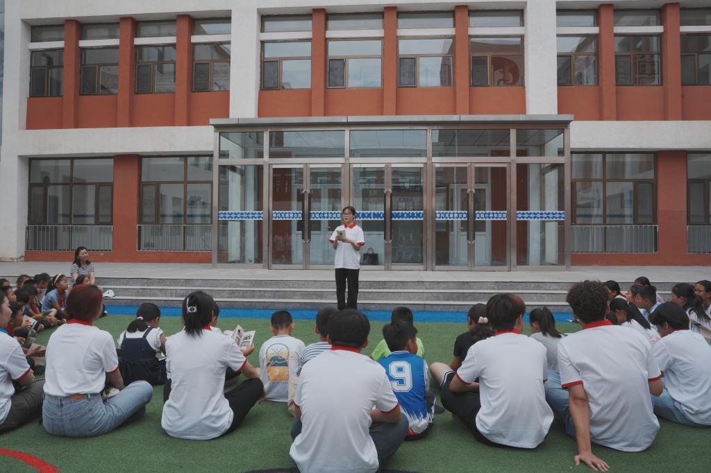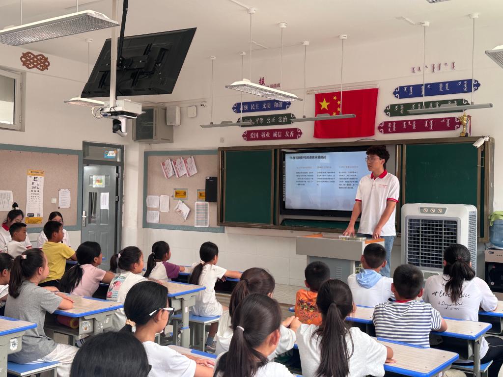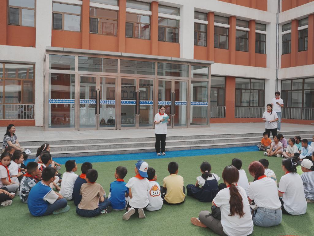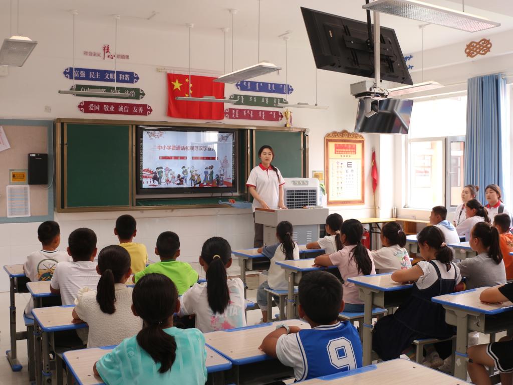 7月8日下午,实践团前往鄂托克旗第一小学开展普通话推广实践。实践团深入小学班级宣讲推普政策、分享民族团结故事、诵读红色文学经典,使小学生感受到语言文字背后的中华文化底蕴和民族团结精神,认识到推广普通话重要意义,教育引导少年学好用好普通话,为中国式现代化贡献自己的力量。