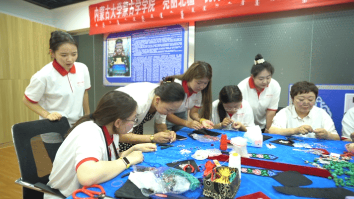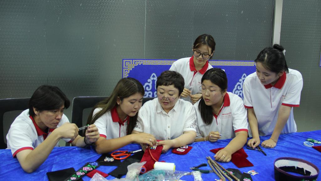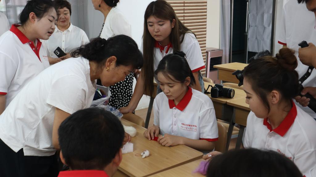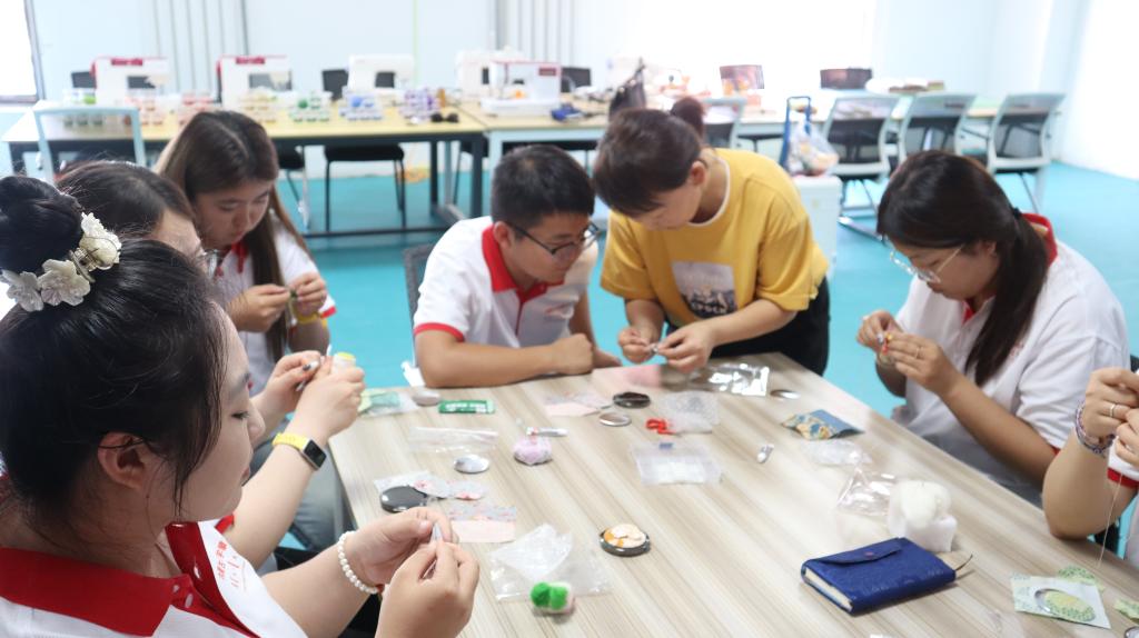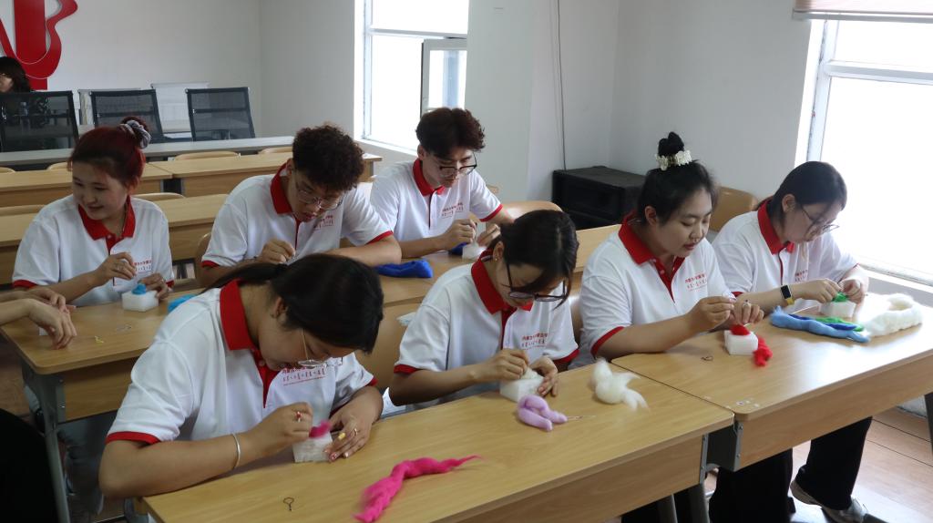 7月9日上午,实践团到鄂托克旗非物质文化遗产传统手工艺保护传承创新体验基地,传习体验了鄂尔多斯蒙古族头饰、毡绣和拼布的制作手工艺。在自治区级非物质文化遗产传承人巴图其其格等老师的悉心指导下,实践团成员学习了解到头饰、毡绣和拼布传统手工艺的文化内涵和制作技巧,经过认真观摩和动手制作,用手中的针线穿出极具民族特色的精美头饰、戳出生动可爱的羊毛毡绣、拼裁出装饰镜面的布艺,体会到非遗手工艺承载的民族文化,领悟到非遗手工艺蕴含的工匠精神,感受到非遗手工艺的艺术之美。